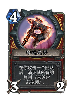 - 旧:在命运之斧消灭一个随从后,消灭其所有的复制(无论它们在哪)。