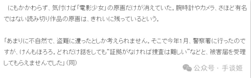 根据他本人描述,他习惯将这些原画锁在地下室的保险柜里,然而在2024年10月份搬家的时候,一个搬运工直接就把《电影少女》的原画都给偷走了。