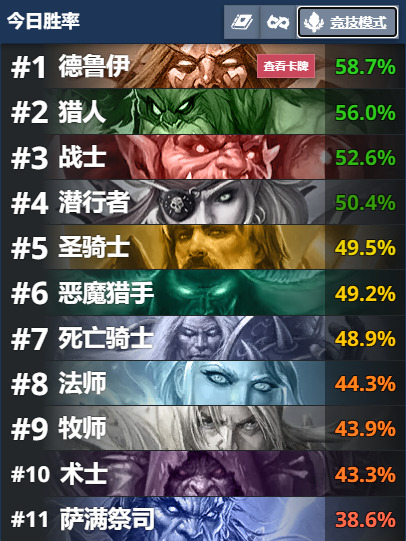 截至1月14日17点竞技场职业胜率梯度表(来源:炉石传说竞技模式指南 - HSReplay.net )