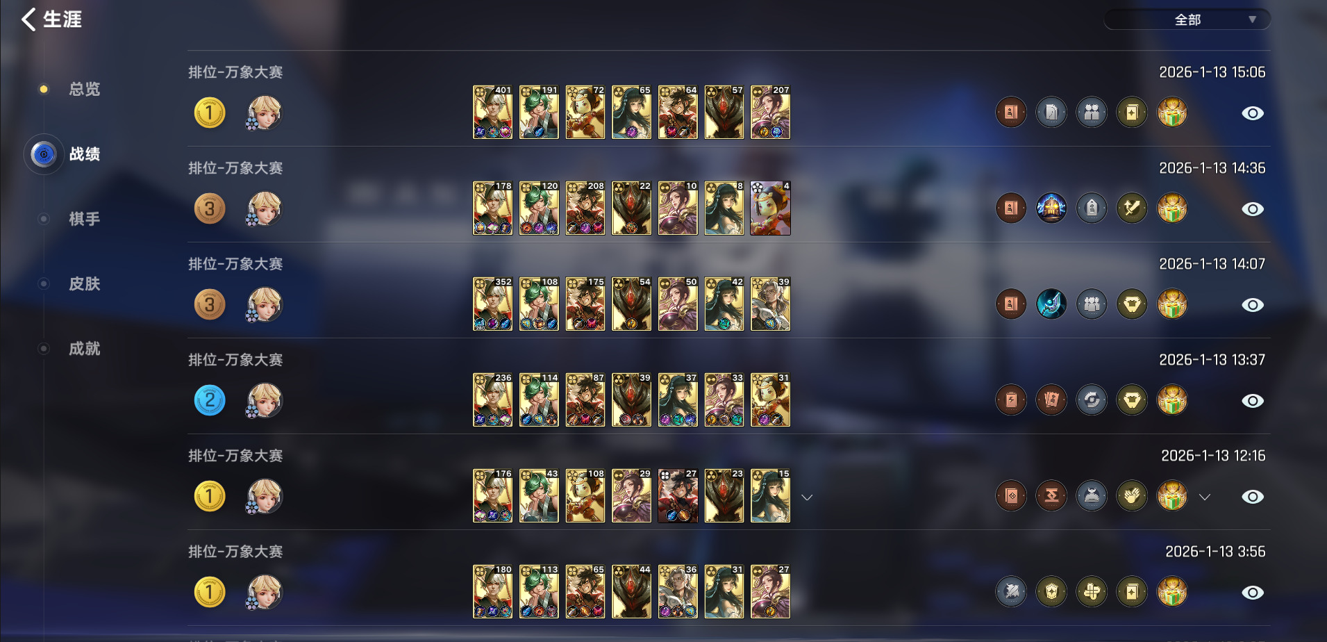 这是在营地写的第二篇万象祺攻略了,分数不高,但也都实践了很多把,希望大家看完能有收获吧。现在世面上的自走棋游戏也是越来越多了,有新的都会去试一下,玩下来感觉最重要的一点还是发什么玩什么,尽量多的了解各个阵容,这样玩起来才会更加得心应手,看完这篇攻略,等哪次你逐鹿牌发多了,就可以试一下。最后祝大家游戏愉快,多多上分。