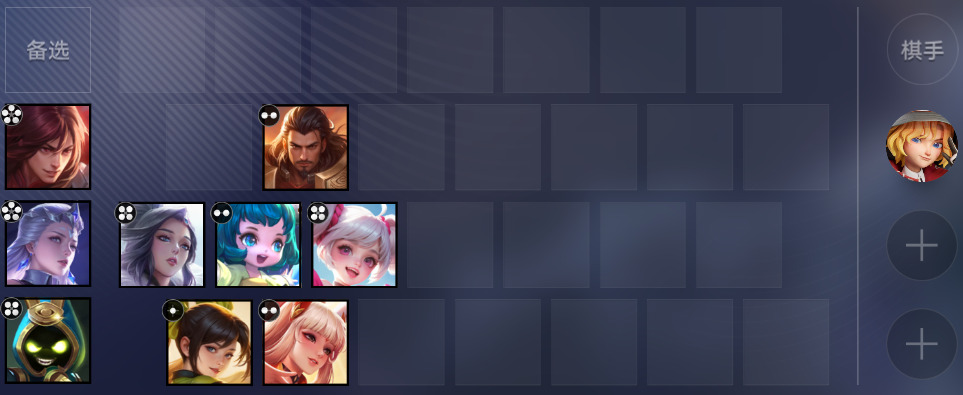 此时就要开始凑最终阵容,曹操、蔡文姬、公孙离、小乔、甄姬、周瑜。如果棋盘格子不够,就用“遗志”或“换帅”词条转换孙尚香的等级,然后把孙尚香卖出,优化阵容结构。这个阶段的核心目标是优先让场上阵容全员觉醒,觉醒之后,就盯着商店刷露娜和三分阵营的卡牌,3 阶以下的登场牌也可以考虑,不断刷新场上英雄的等级,强化阵容战力。