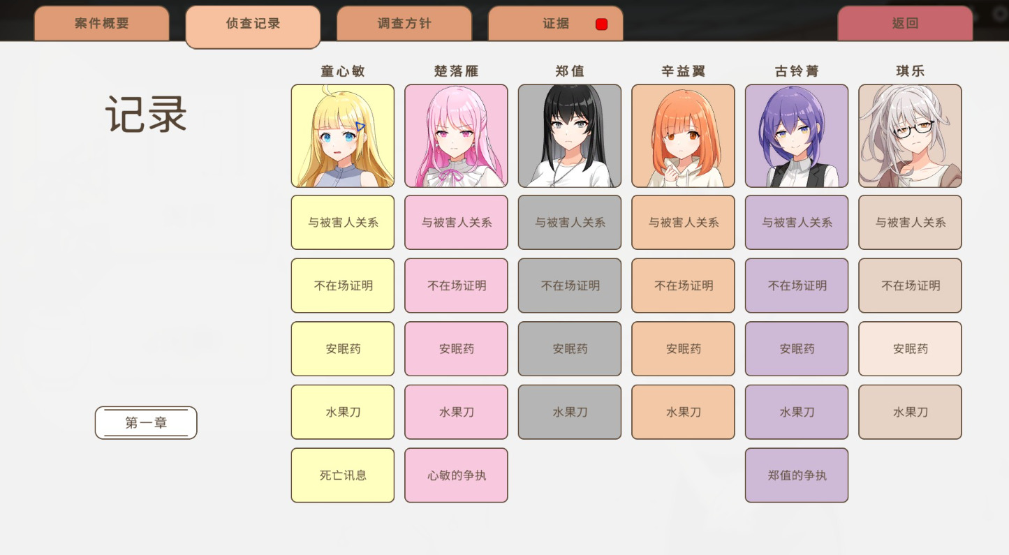 只有对所有人都进行一次排查才会开启新的功能——推理环节,根据六个人给出的线索,结合着证词进行凶手指控。只有分析出谁的嫌疑最大才会进入下一轮,否则就是持续的重新指控也就是进入下一个模拟庭审环节,之后就是法庭上的传唤,不过游戏的本质还是需要听大家的说辞中发现漏洞从而更进一步的确认谁是凶手,也是从此刻开始,大家肯透露的东西也是越来越多了