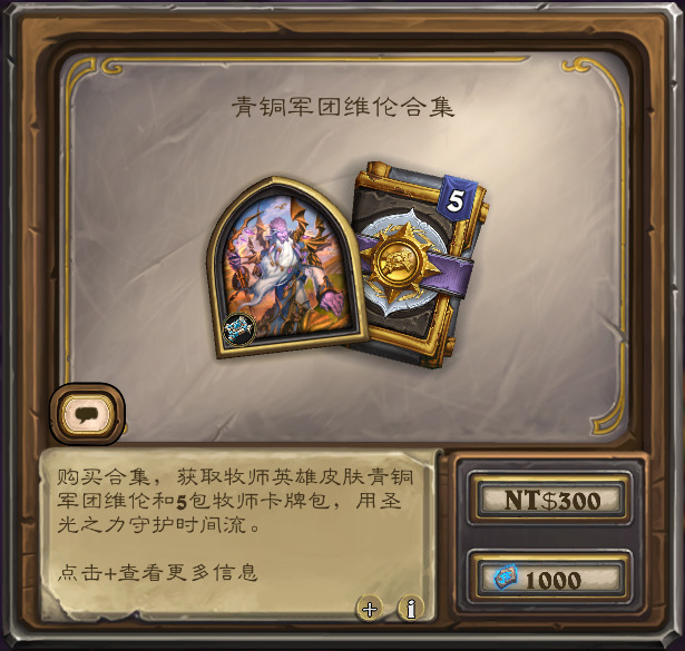含构筑模式牧师新皮肤“青铜军团维伦”和5牧师包,售价600奥术宝珠(国服)/1000符文石(外服)。