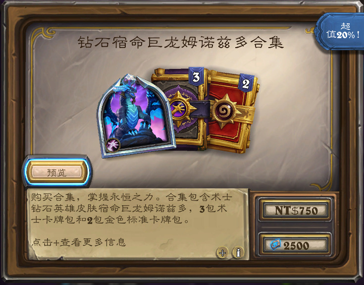 含构筑模式(钻石级)术士新皮肤“宿命巨龙姆诺兹多”,3术士包和2标准金包,售价1580奥术宝珠(国服)/2500符文石(外服)。