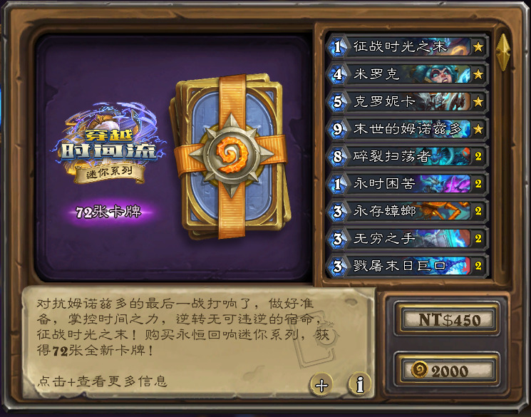 含构筑全套普通或金色永恒回响卡牌,其中金版还含钻石末世的姆诺兹多,普版售价2000金币或98人民币(国服)/15美元(外服),金版售价10000金币或388人民币(国服)/60美元(外服)。