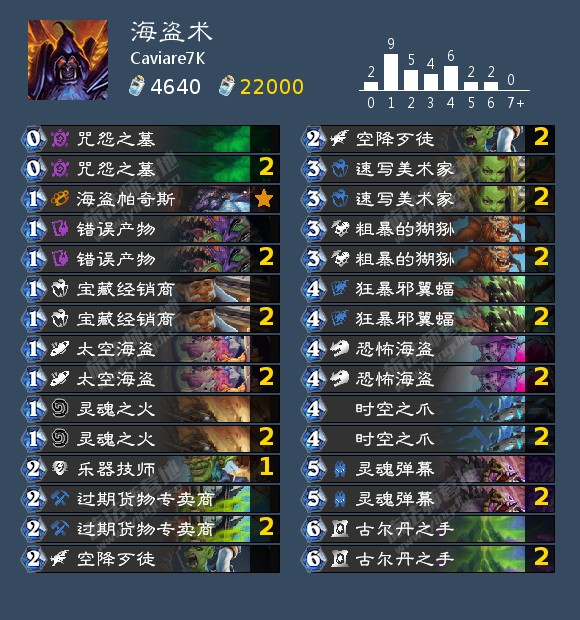 起手留牌方面,一定要明白这套卡组有着相对严格的手牌逻辑,不能像暗牧一样追求手里全是空降海盗,而是要找刀和手这两张牌(下位替代是乐器技师和速写美术家)。两张牌都到的话可以留一费海盗,否则全力找缺的那张。通常来说,算上帕奇斯有七张一费,很难空过。另外,关于咒怨之墓,我认为起手是不留的,如果换牌后上手,可以根据对局决定是赌一费海盗还是后续找组件。