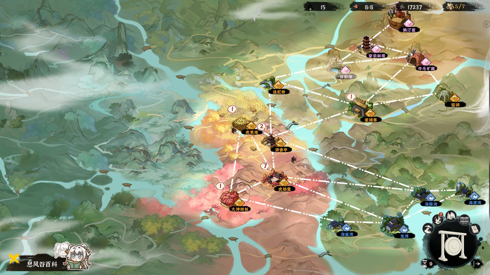 游戏的大地图就是一张策略沙盘,虎焰堂作为你的初始据点,如同茫茫大海中的一叶扁舟。每回合你会获得固定的行动点数,这些点数要分配给探索、攻占据点、发展内政、招募弟子等一系列操作。