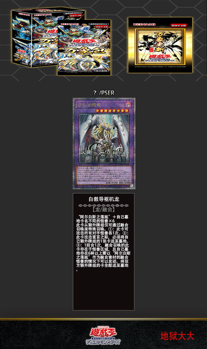 1包5张,1盒15包种类:全151种SER-SRV(银碎红字稀有卡) 2种UR(金闪稀有卡) 20种SR(面闪稀有卡) 30种N(普卡) 99种※全卡其中20种存在有PSER(镜碎稀有)版本※全卡其中18种存在有SER-SRV(银碎红字稀有)版本※金闪稀有卡、面闪稀有卡也有SER(银碎稀有)版本