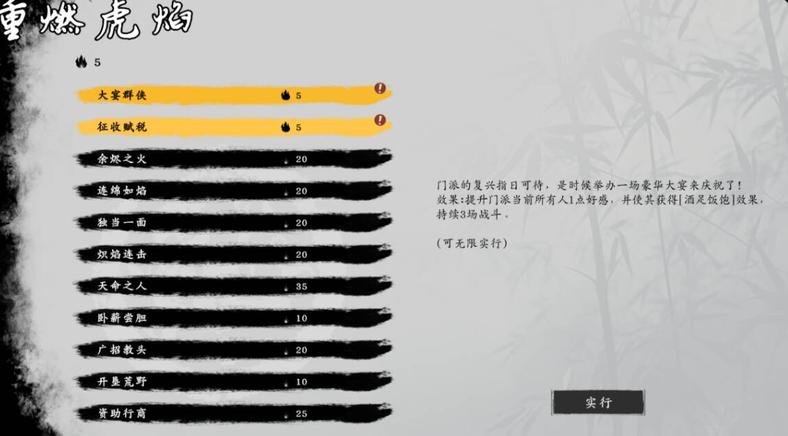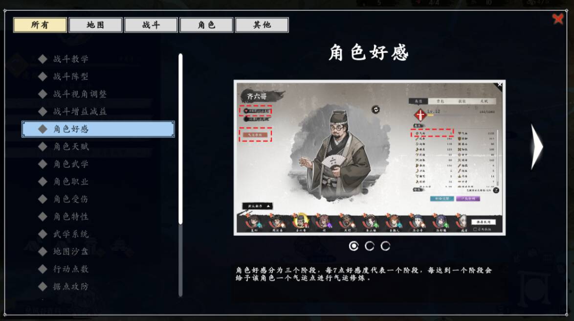 此外游戏的其余玩法也算是非常的不错,颇有令人眼前一亮的感觉。首先是每名角色都有好感值,好感值影响着角色的气运修炼,而且一些主要的剧情角色也会与之对应的随着好感值的增加而推进相相对应的剧情发展。而气运修炼又关乎到非常重要的角色特性,这些角色特性一般都是非常强力的永久效果,除去一些专属支线能解锁一些角色特性之外,就只能通过好感度系统来获得气运点开启角色特性。除此之外,角色也有各种职业之分,武学也有外功、内功、轻功三种功法。有趣的是,如果我们的角色已经学会了某种武学,再次对其使用这本武学时,他则会代替我们传授这门武学给别的角色。