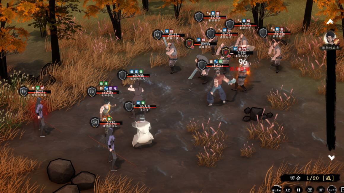 接着来说说游戏的战斗方面。其实相比demo版本,正式版本的战斗系统是做出了一定的改变的。正式版本由demo版本的类自走棋玩法改为了半自动回合制模式,分为谋略阶段(选择技能)和行动阶段(根据技能选择和站位开启战斗)。但实际上当我们对站位进行选择之后,在战斗中选择进行“auto“模式,其实就与demo版本几乎无异。不能说这种改动是完全负面的,其实这也对一些对于战斗方面要求比较高的玩家有了一定的选择。此外游戏在战斗中的各种信息标识也是比较简洁明了的,直观的左右双方区分敌我,人物血条也都有明显的数值显示,各种增益减益buff都会标识在人物血条上方。最值得称道的就是这些buff都以颜色来表明他们所属的类别。例如绿色为战斗增益、红色为战斗减益、蓝色为角色特性、棕色为职业天赋、紫色为装备效果。