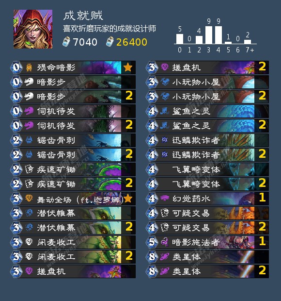 卡组的基本构筑思路和类星体贼一样,只不过把法强OTK组件换成了成就组件。启动方式就是鲨鱼之灵+飞翼畸变体+544复制+两个11畸变体+舞动全场回手再刷一轮+幻觉药水回手等两回合后再刷一轮(如果还活着)。
