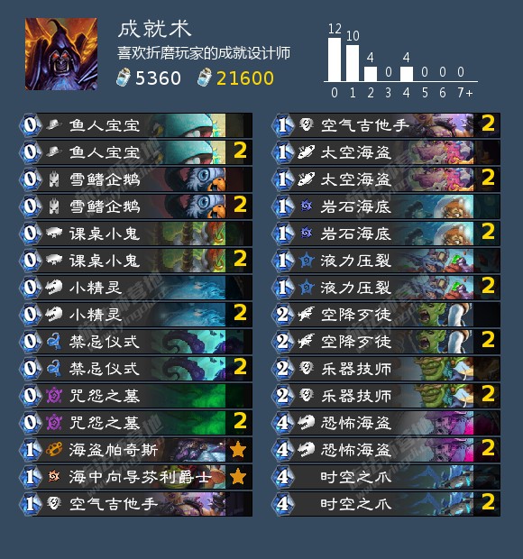 卡组里塞满一堆0费牌方便打空手牌,带212抽刀、发现和探底保证刀的上手率。为了提前开始砍的回合数带上太空海盗减费,顺便带了一套海盗体系提供一点场面(尽量活到刀砍完的回合)。同时带上空气吉他手给刀加耐久以求多砍几刀。测试的时候还尝试过藏宝匪贼复活刀的方案,由于实战中每次都被弃掉从未发挥过作用最后放弃了。