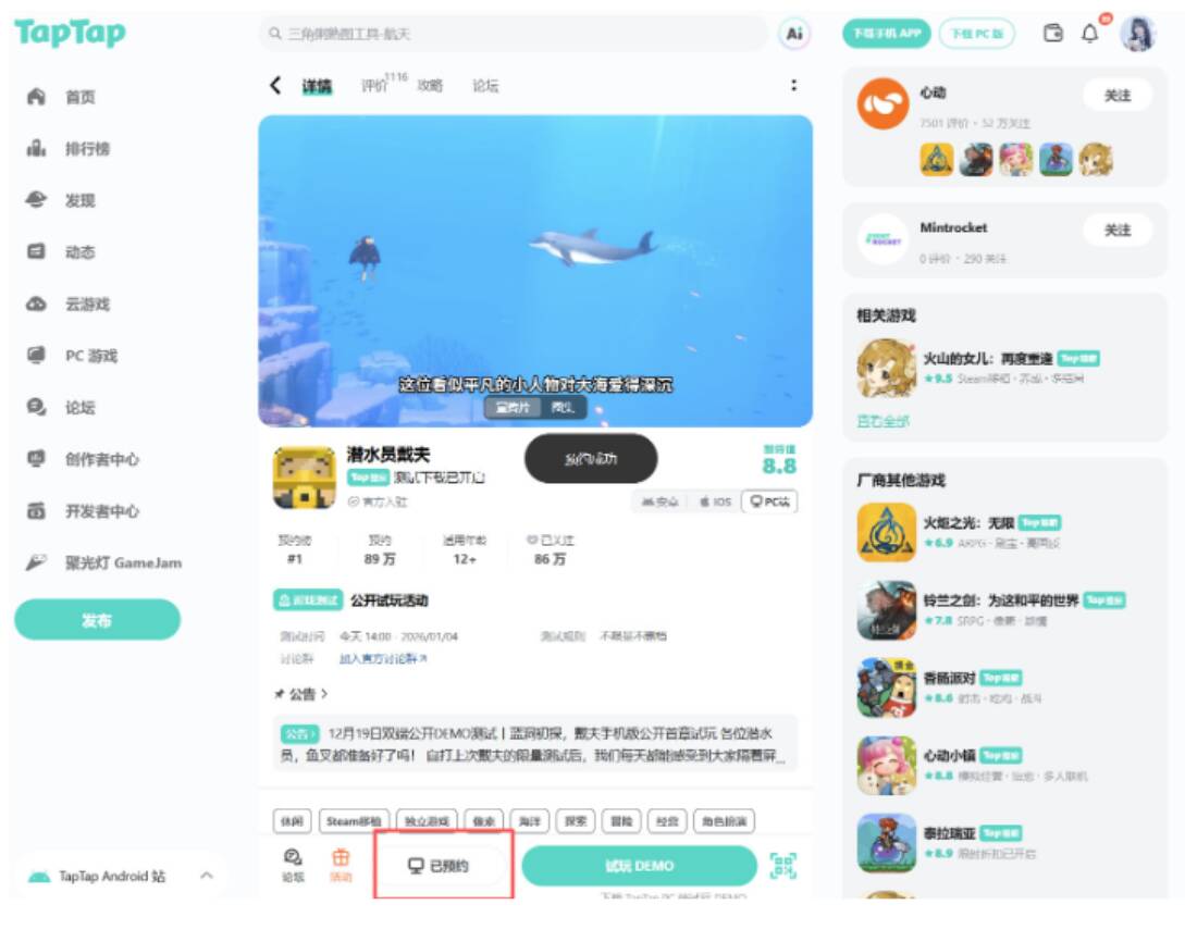 上述首发折扣活动将持续至2026年2月23日,覆盖整个春节假期。此外,TapTap平台还将推出手机版与PC版的捆绑包活动,在折扣价基础上提供额外优惠,并配合优惠券等福利,回馈首批玩家。目前App Store 预订通道已正式开启,苹果用户可搜索“潜水员戴夫”提前预约游戏。