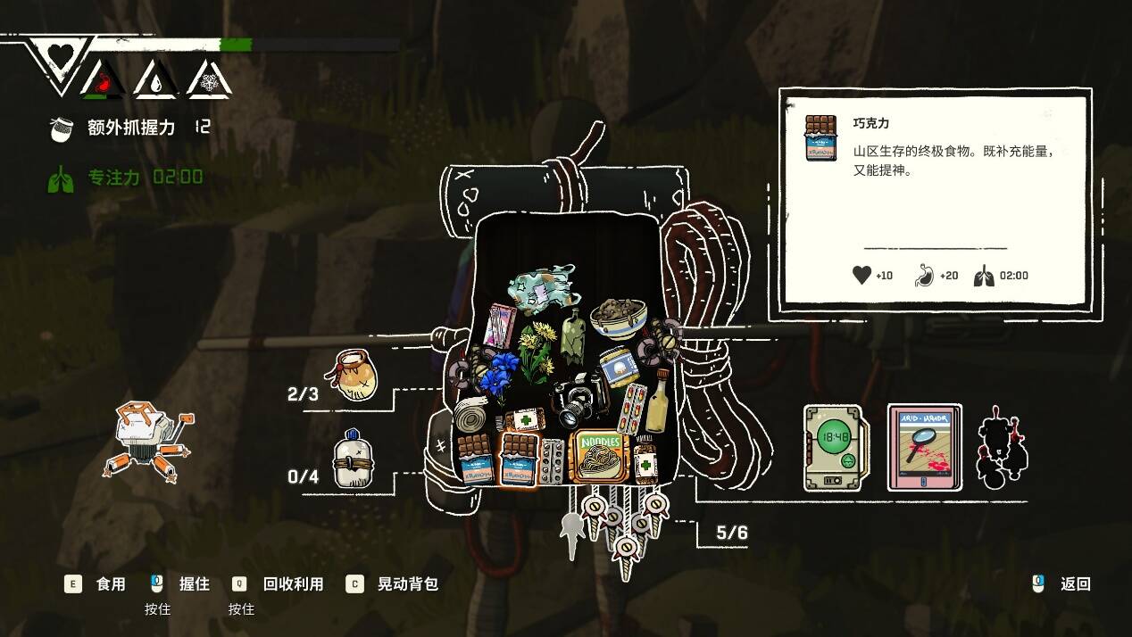 此外,在攀登过程中,玩家还可能在山路上收集各种道具,特别是食物等重要物资来维系生存和能力。三个主要指标中饥饿影响玩家的体力、握力水平,水一定程度上决定了玩家的专注力和生存状态,温度则随着高度的金发产生更大的挑战。另外,玩家收集到的各种“垃圾”也可以通过回收在等待后转化为有效的资源。