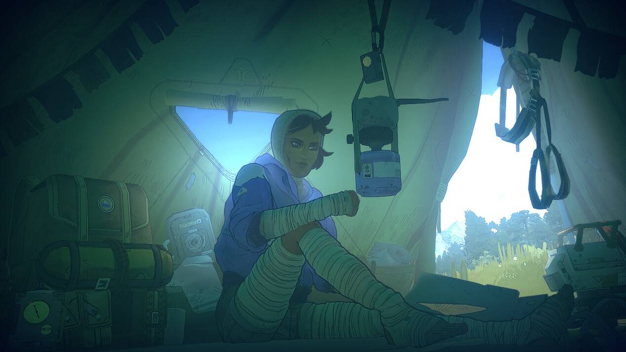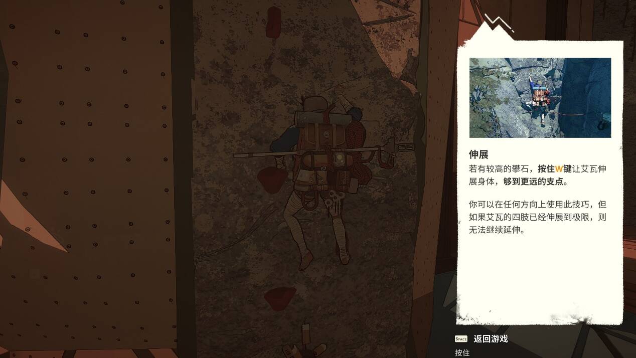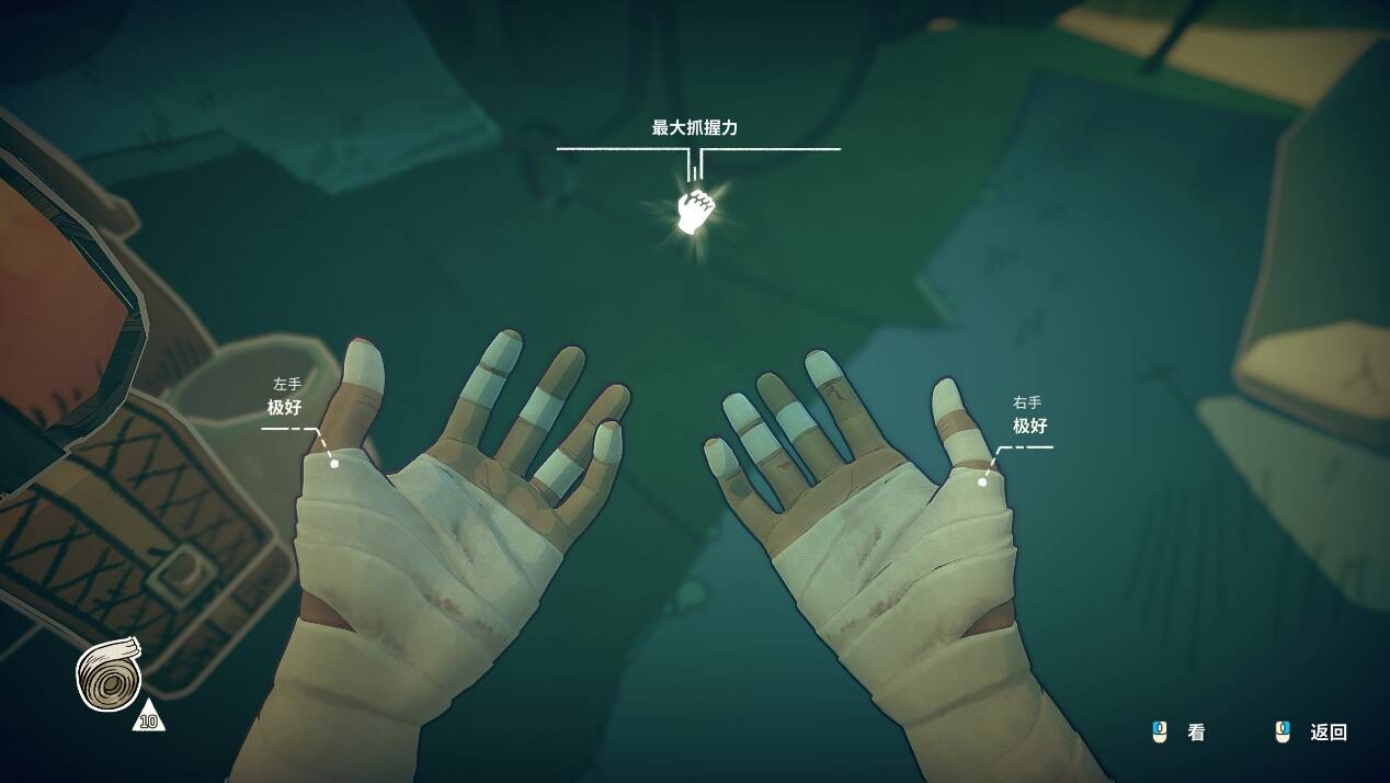 与攀爬的动作对应的,则是本作对各项能力的数值化、资源化设计。游戏中,玩家的握力、体力等都会受到各项指标的影响,而回复指标的方法,则主要来自在营地的修养和恢复。