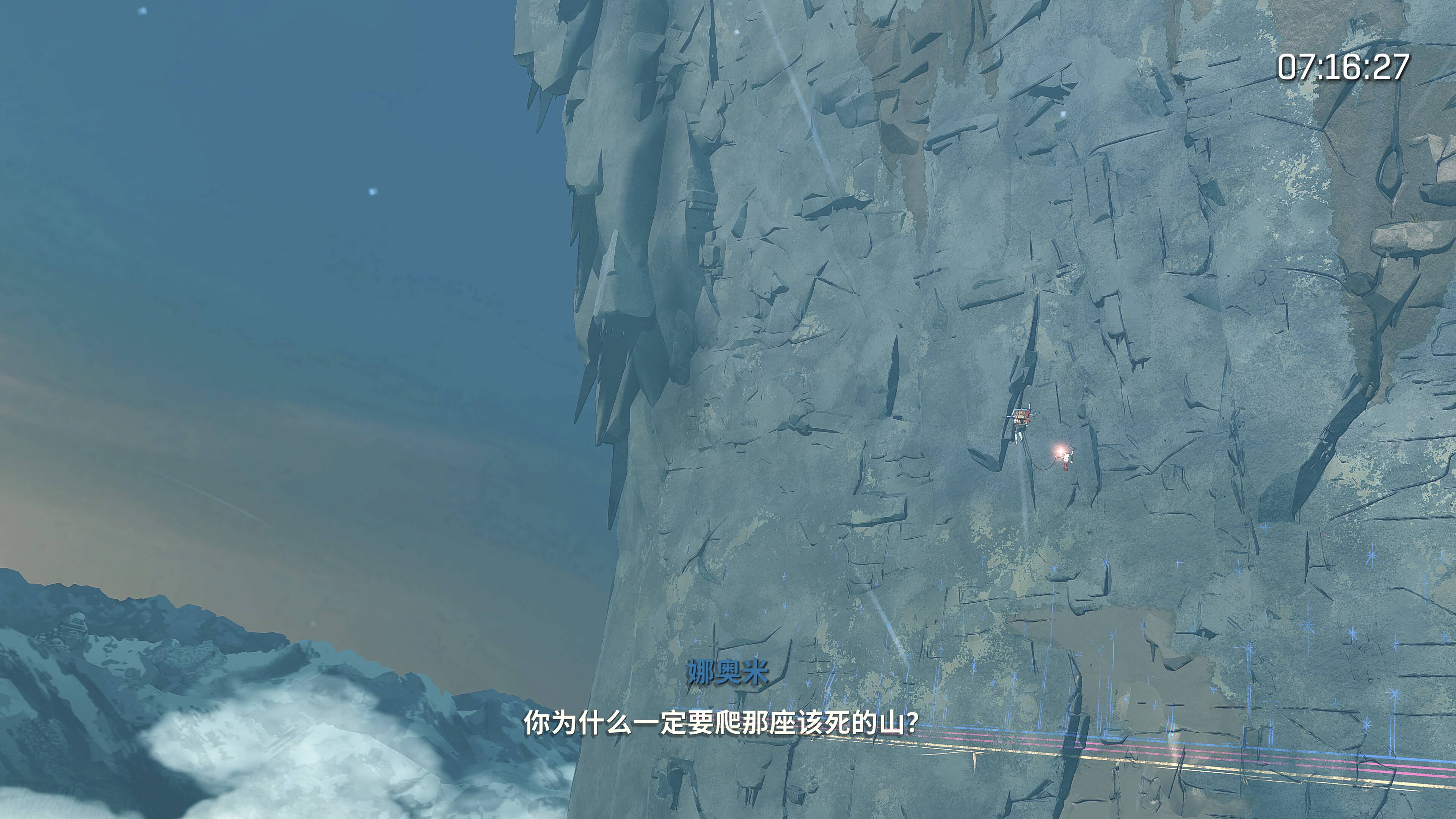 这一切共同营造出一种前所未有的孤独叙事与沉浸氛围。没有长篇累牍的对话,故事散落在沿途:一段前人留下的涂鸦、一具登山者的遗骸、一台损坏的老式机器人。同时,艾瓦携带的“智攀宝”机器人会偶尔播放来自山下世界的电话留言,这些碎片化的信息,与她沉默的攀登和偶尔的冰冷独白交织,慢慢拼凑出她的执念和故事。