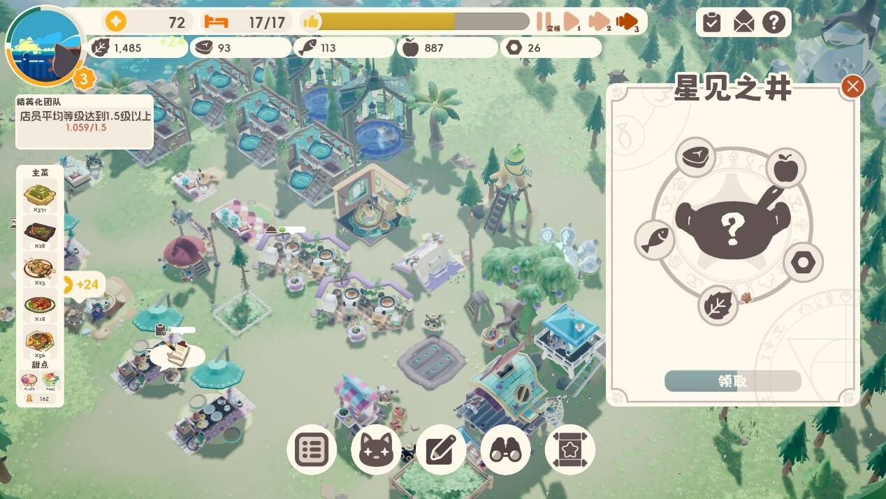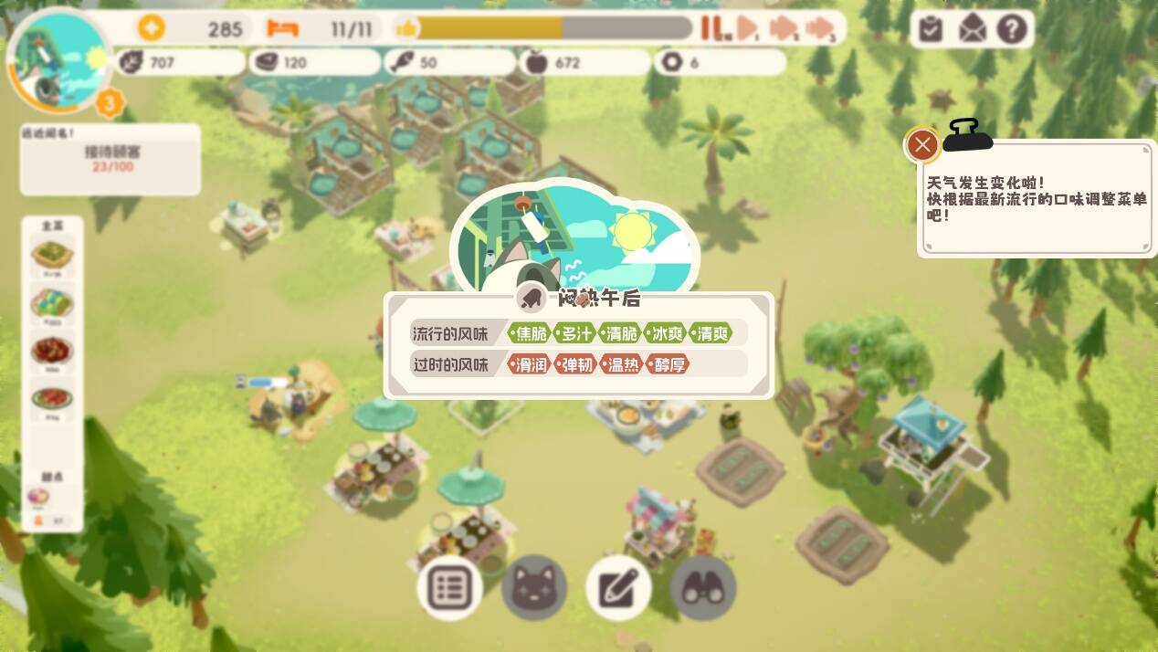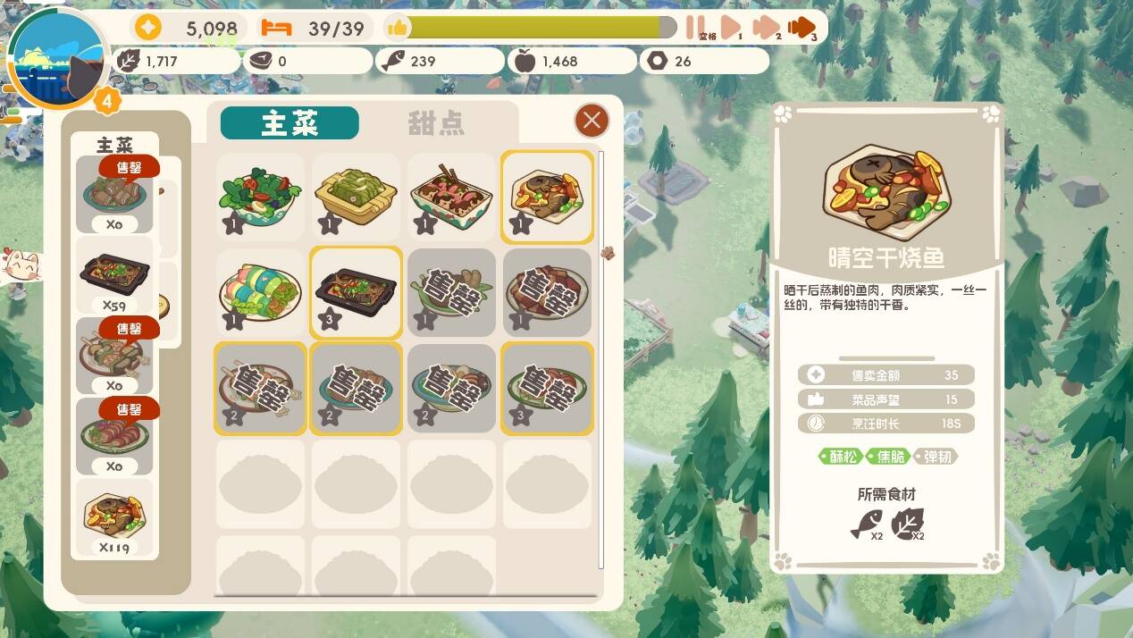 不同的菜品需要不同的资源和烹饪时间,菜谱需要随着玩家完成任务或探索奖励进行解锁。