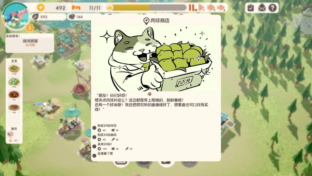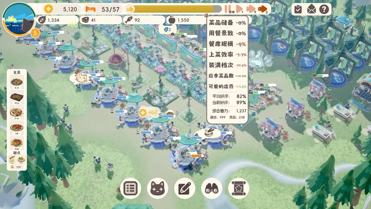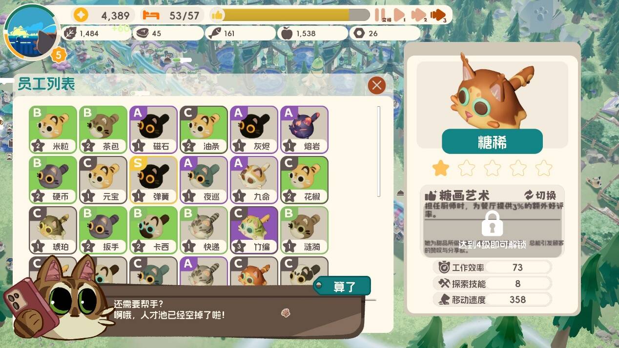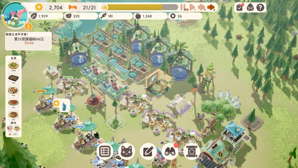 目前游戏中提供了54只不同的猫猫可供招募,每只猫都具有哦独特的工作能力、移动速度和探索能力数值。玩家可以使用金币训练猫咪获得更高的基础属性和被动技能。这也意味着本作的地图规划会影响玩家的上菜效率,需要更加细致的规划餐桌、厨房等的具体位置。