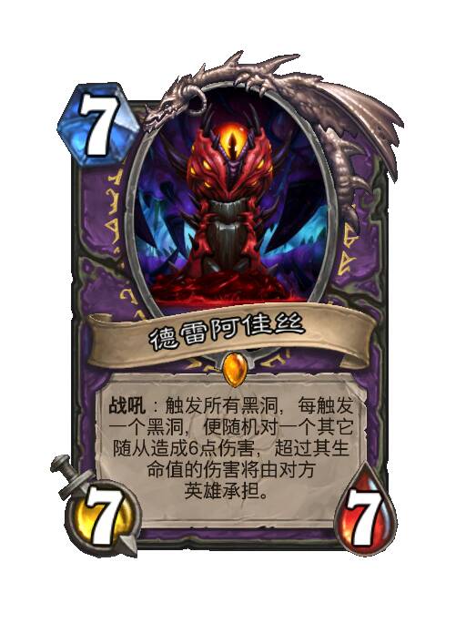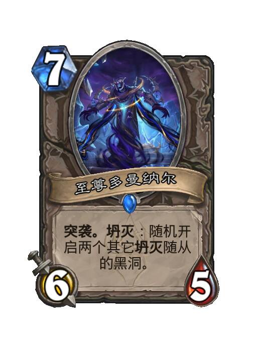 诸界吞噬者迪门修斯是一张强大的中立英雄牌,它生成的黑洞都是无效果的普通黑洞,但依然可以吞噬随从,后续卡牌中还有一些可以生成没有效果的黑洞的卡牌。