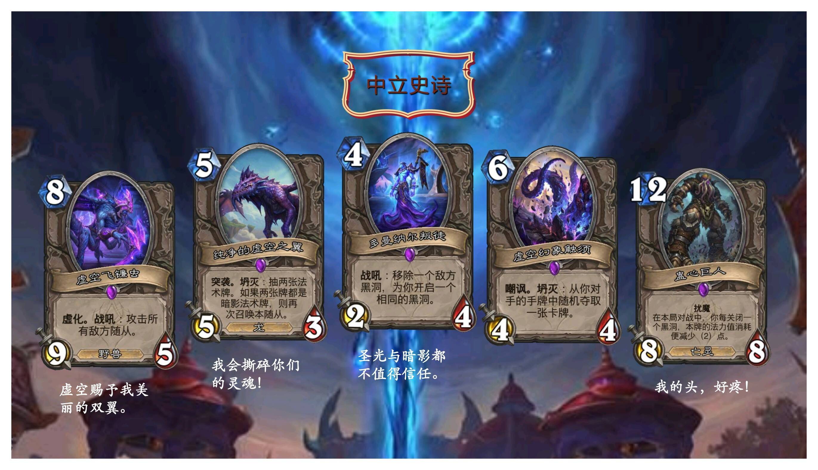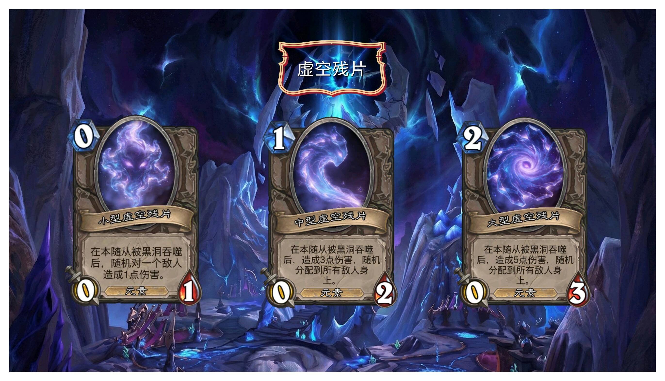虚空残片除中立的两张卡牌外,仅法师、牧师、恶魔猎手和潜行者可以获得。在打开虚空风暴之门后,虚空残片的效果无法被触发。