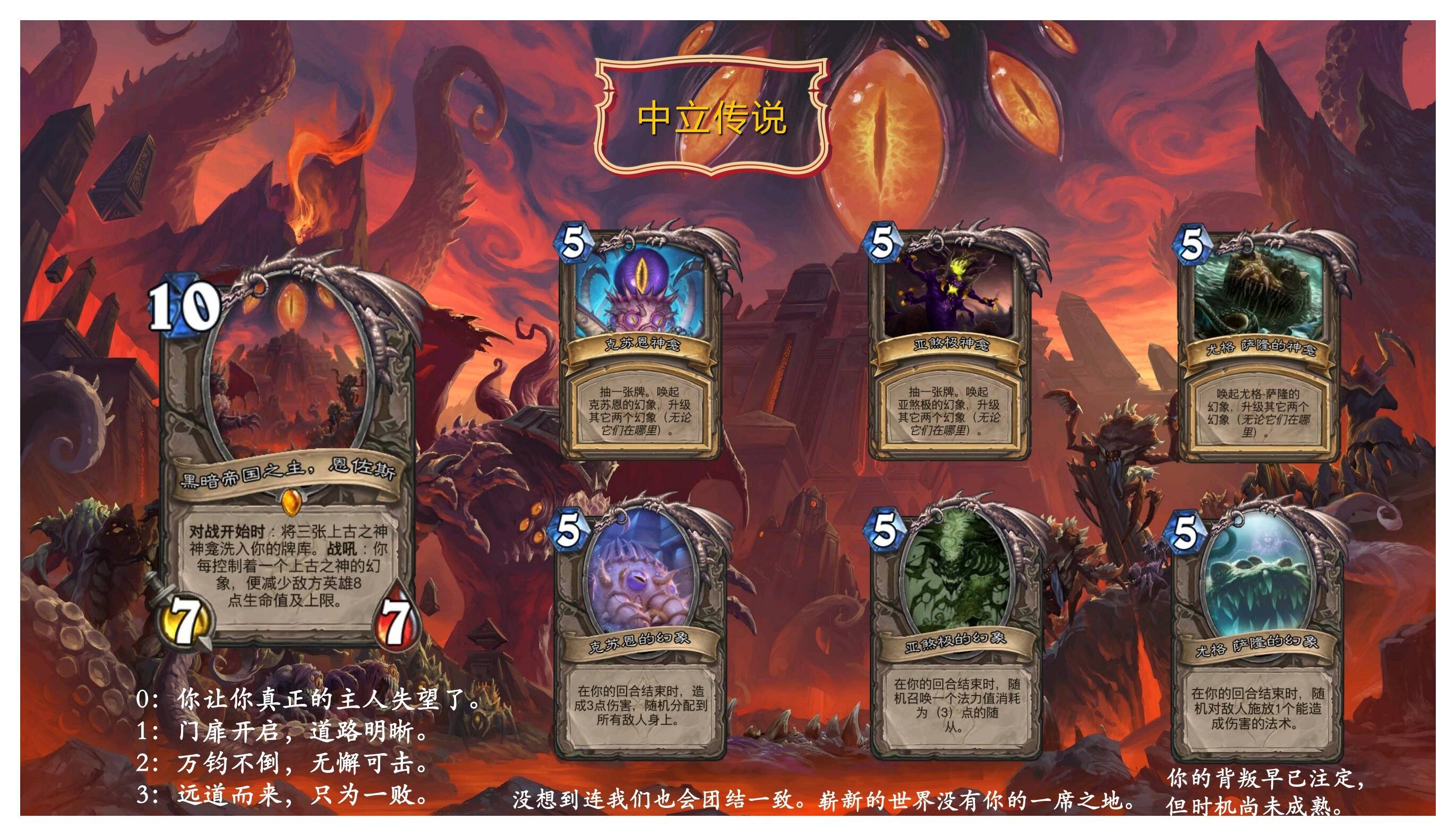 术士,猎人,德鲁伊和战士分别得到了四位古神赐予的强力随从卡牌,这些卡牌的身材都为7/7,且每一个都极其强大。