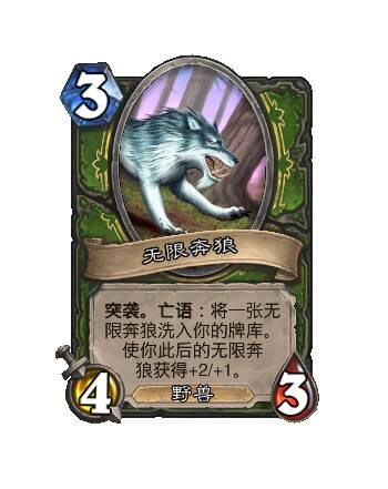 - 新:[3费] 突袭。亡语:将一张无限奔狼洗入你的牌库。使你此后的无限奔狼获得+2/+1。