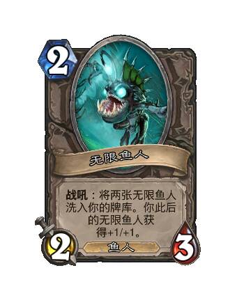 - 新:[2费2/3] 战吼:将两张无限鱼人洗入你的牌库。你此后的无限鱼人获得+1/+1。