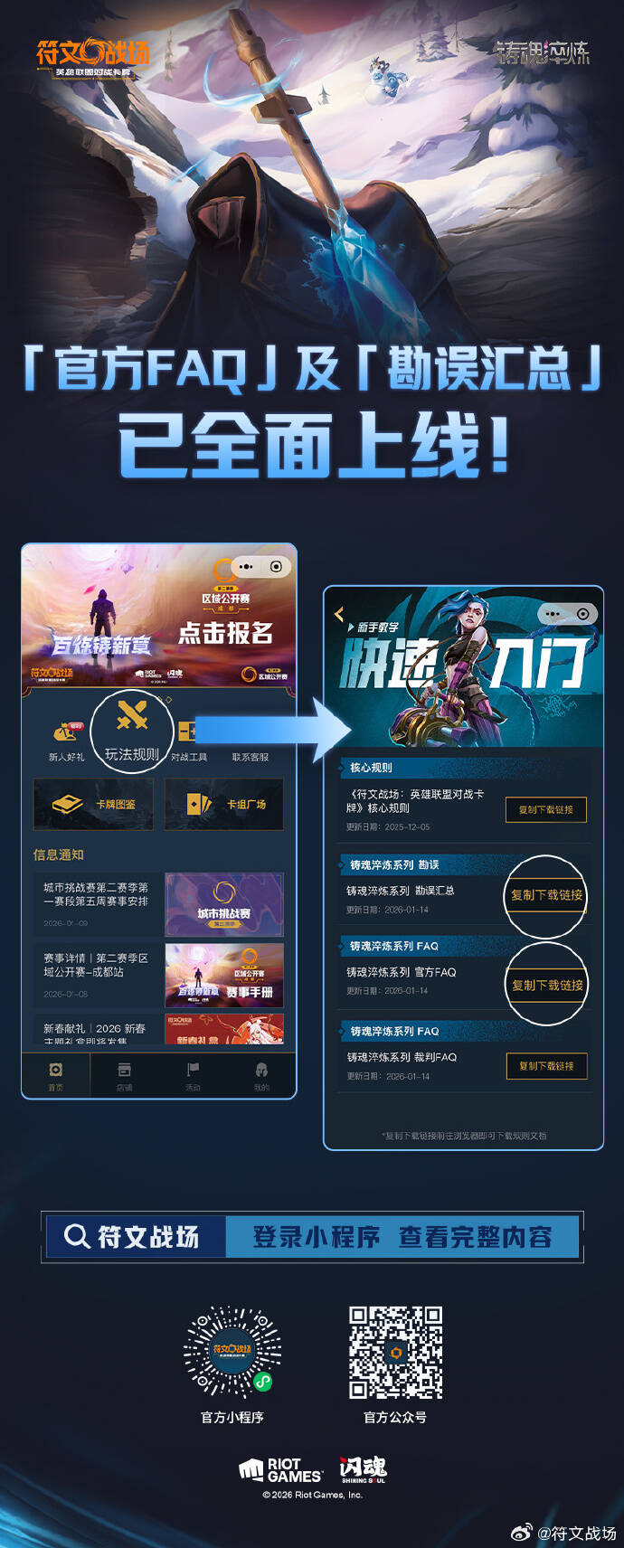 《符文战场》第二赛季区域公开赛-福州站 将于1月17日正式开赛,为帮助各位召唤师更好备战此站及后续赛事,解答「铸魂淬炼」系列上线以来的各类问题,并严格统一各级别赛事判罚标准,「铸魂淬炼系列」官方FAQ及勘误汇总已于1月14日正式上线。