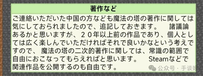 实际上,大概是出于担心版权问题或者只是单纯地想要交流,中国网友曾经溯源并联系上了《魔塔》最初的制作人渡边直。和想象中因为版权问题而大发雷霆的画面不同,渡边直本人对此持开放态度,甚至在个人主页专门cue了百度贴吧,特意开了仨框,聊到了中国网友的热情和创作。