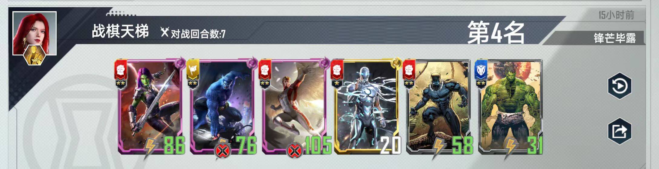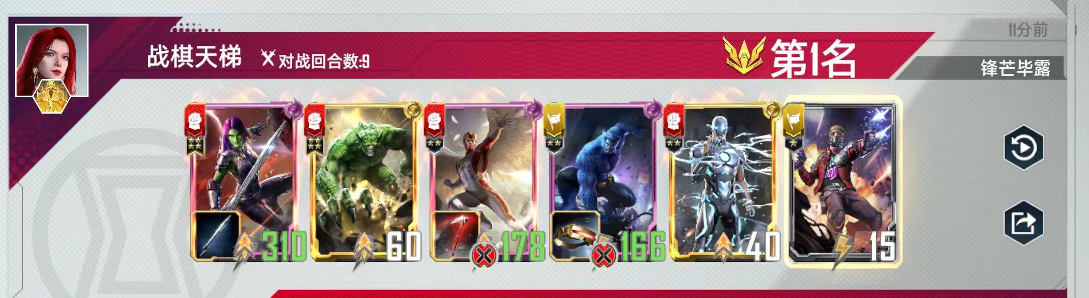 那如果黑豹不来我们的卡魔拉凑齐了呐,那就很费脑子了,恶形怪突袭等速度战力拿一下,武器也特意拿了金刚狼利刃速度拉满战力保证破敌效率三回合三十攻还是很稳定的,注意前期可以适当单挂高战力卡魔拉,没成型不上,觉醒不着急,破敌一定要快,我们超级赌狗一点防守都没有,前期能输就输了,后期成型命石艾丽卡,泽莫满入直接给,速度下一把,爽就行了,不卡牌的发牌员那还说啥了,玩的太带劲了。