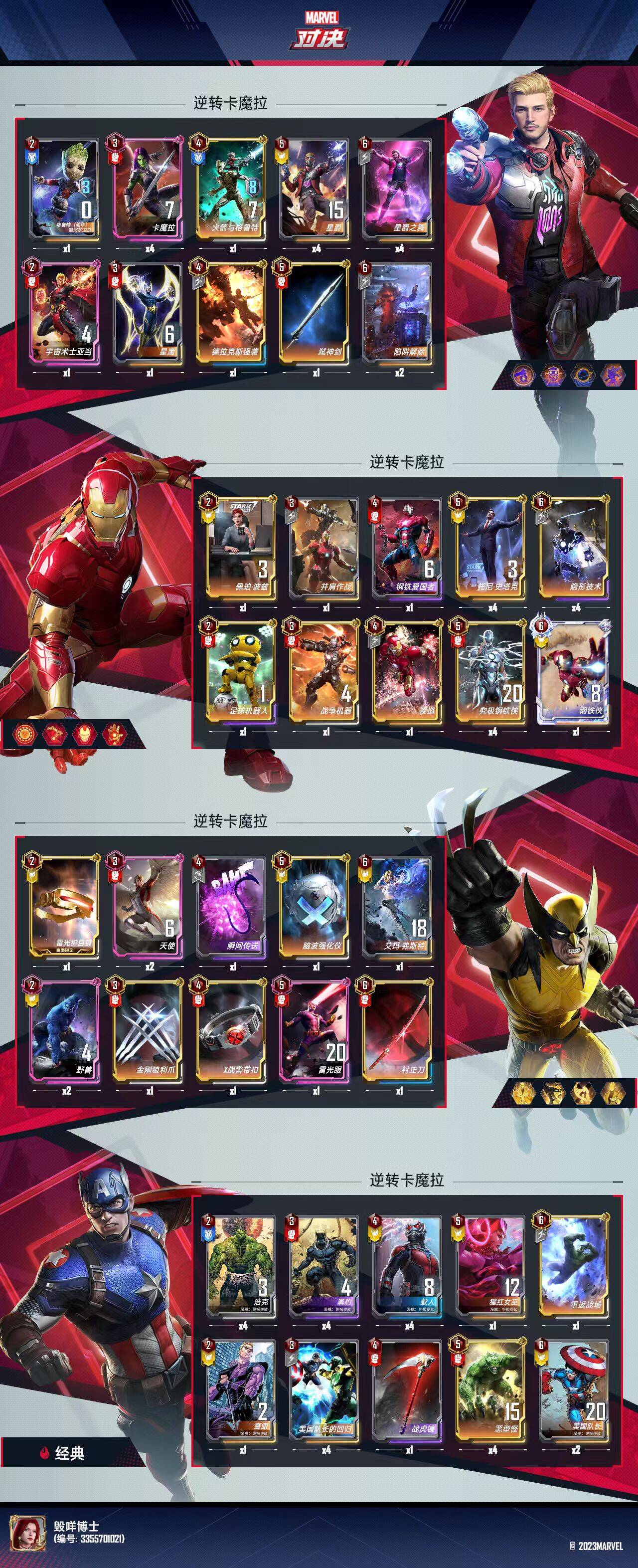 赛季初我本来以为这个卡三本卡魔拉会强度不够,结果最近打了几把发现问题不对,胡起来真的很大,但是聪明的我又对这种感觉和小洛基能坐一桌的卡到六七本才给关键牌的卡组敬而远之,此时我的战令塞给了我一张逆转女巫一张逆转美队,于是就有了上面这个宇宙究极缝合怪卡组。