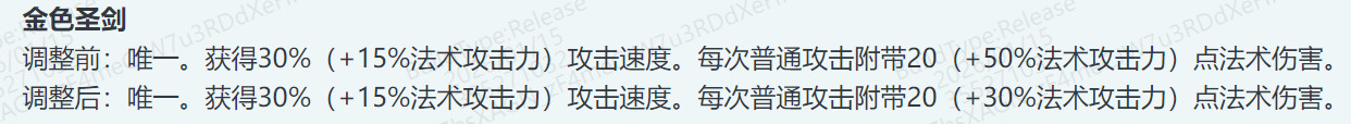 金色圣剑削弱,在之前对于法师来说过于泛用数值极高,攻速的提升还能加快技能释放,是合理削弱。