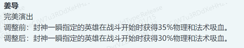 吸血效果削弱,依旧是针对单核体系的削弱,降低5%的吸血在后期对方如果有成型大核如公孙离和狄仁杰基本上影响不大,如果对手输出不足30%的吸血依旧足够。