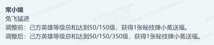 常小娥史诗级加强,这多出来的一次送福基本会在到达六级棋手等级后送达,让数值提升有极大的跨越,350级的门槛基本上要配合一些有备战等级成长的阵容,不推荐玩日落海阵容。