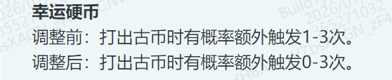 原先的幸运硬币过强,很容易膨胀狄仁杰的攻速数值,这次改动让额外收益期望降低,从原先平均多2次,改为平均多1.5次。