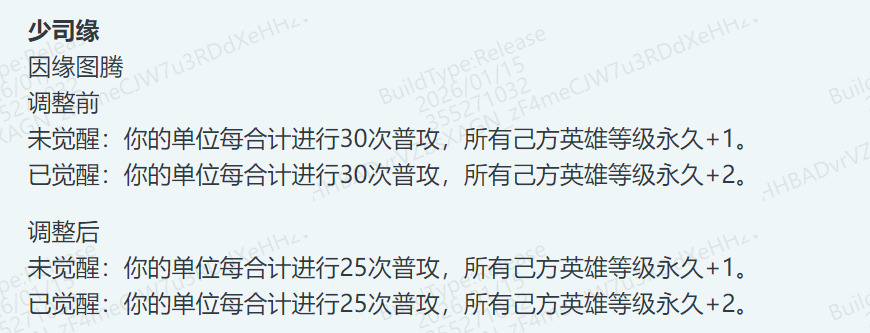 少司缘加强,本身少司缘的战力非常低,基本上就是站桩白板牌,80点的法力上限基本一场对局只能放出一次技能,而且仅是回一定的血量,所以其关键就在于配合攻速单位的等级成长,这次改动对大河虞姬阿离双核有比较大的加强