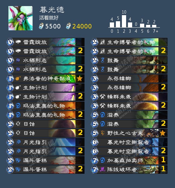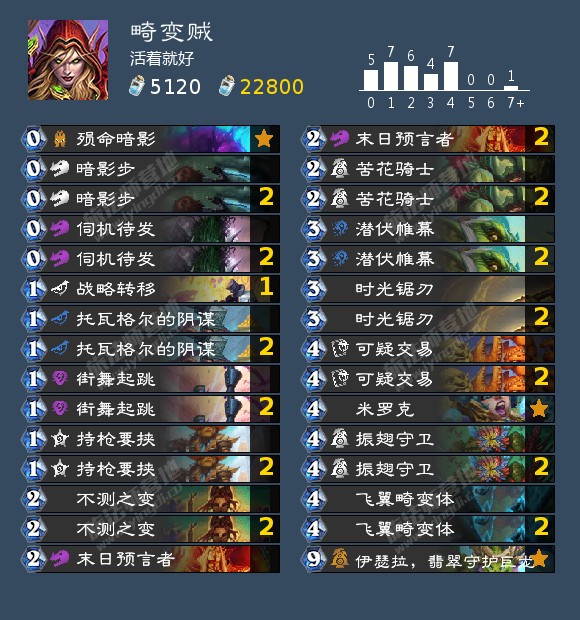 攻略就是起手留苦涩结局,然后7费配合战路一起使用。如果敌人随从不足3个,可以用放入鳄鱼给对手随从。