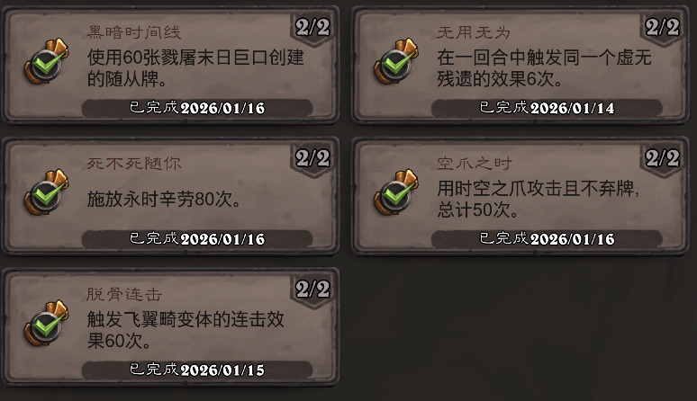 累积型成就,很恶心。这个成就做起来很恶心,泄手牌是个大问题,所以作者我构建都是低费,即使这样也经常出现爪子2个都上手的情况。