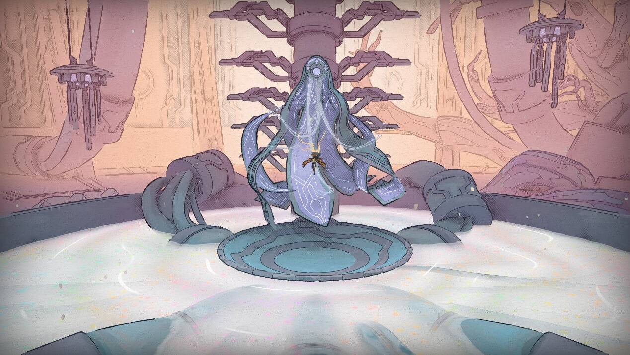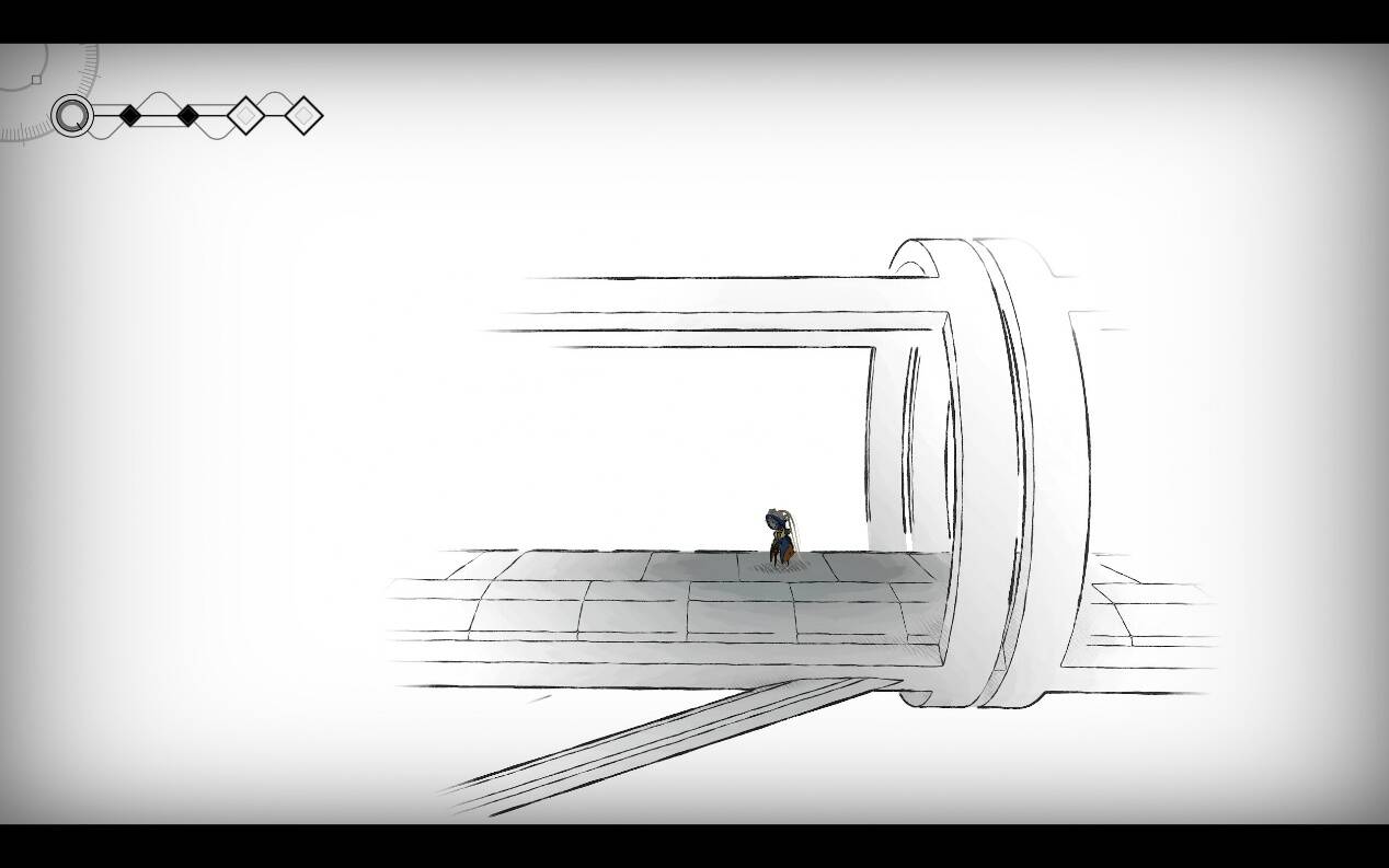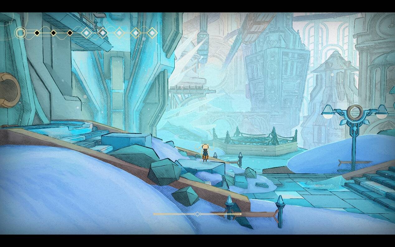 不过,仍需指出的是,或许是向叙事性进行了让步,《MIO》的引导系统做的非常模糊,大多来自于NPC或碎片探索奖励的只言片语,这意味着玩家可能不得不面对偶发的“卡关”——特别是在特色美术的作用下,过度整齐的画面天生遮蔽了少量的地图信息,使得探索稍显障碍。但是这次是真的瑕不掩瑜——在主线故事的引导下,障碍更多影响的是游戏难度,而非探索完整度。