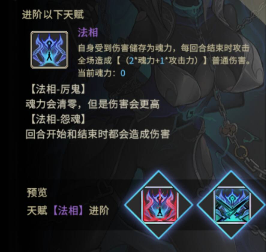 自身受到伤害储存为魂力,每回合结束时攻击全场造成[(2*魂力+1*攻击力)]普通伤害。