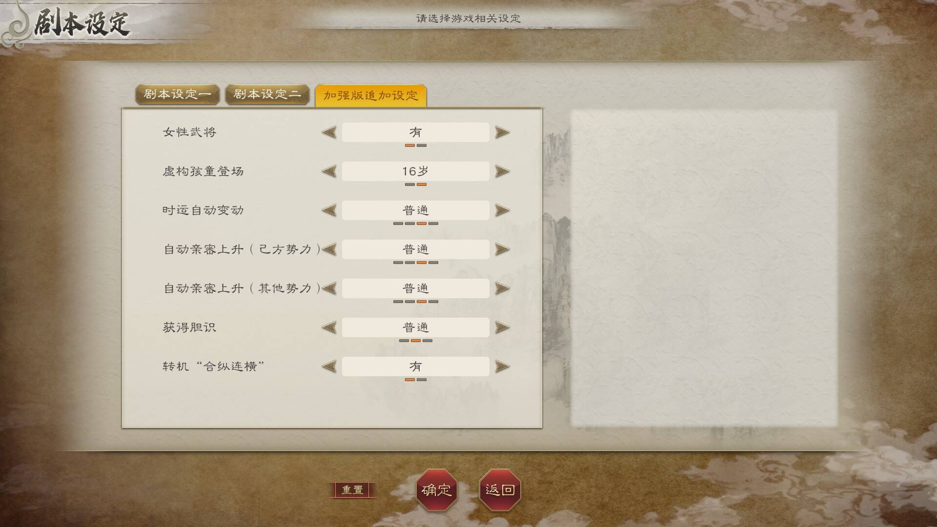 本次DLC最显性的系统入口,在于游戏主界面新增的独立 “剧本设置”页面。除了系列常见的“虚构武将登场”、“女性武将比例”等选项外,最关键的新增选项莫过于 “转运事件”的开关与强度调节。