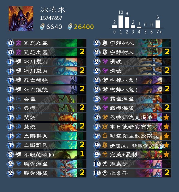 #3⃣打法说明:保障自己不死不爆牌的前提下,能过多少牌是就过多少牌,尽量不要污染死亡的亡语库(1费地标不要找亡语牌),0费的咒怨之墓不要随便找,没那个命的,一定要考虑下回合怎么打,有复生的海盗可以考虑下回合能不能继续冻住。