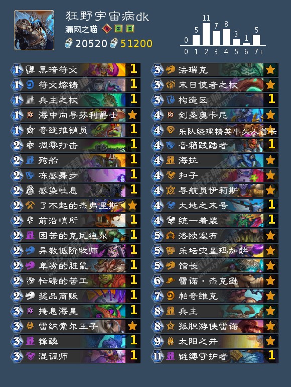 迷你包之后环境就变得非常恶劣,天梯里全是术士和德鲁伊,少了奥丁/超杀战和冰法,优势对局没有了。德爹太狠了,各种形态的德鲁伊都是拼尽全力无法战胜,已经变成看见德鲁伊心里就发堵的程度。相对而言,对阵蛋术我们带了统一着装之后要比之前好打一些,唔,萨满大人的牌就是好用;弹幕术以前还能掰掰手腕,现在补强了刀之后太难打了,直伤太多,有时候就刚刚好的伤害死掉了,均势的局现在变成劣势了。我现在最喜欢和蛋术打了,就是感觉输了也不会有多难受,但是赢了会非常开心,尤其是他们都不会像遇见萨满或法师那样去防衰变,3费准时下蛋,4费吃统一着装后直接跑,感觉非常有意思。起手找刀的组件和海星、姐夫、统一着装,如果对面蛋是一血,姐夫是有可能卡出大地震击的,不过我就卡出过一次。统一着装如果没准时来,就用场上随从去拆他的蛋,不要让他用安布拉去生成更多的蛋,一个20/20总比一堆20/20附带着几个亡语蛋要好处理些,虽然我们限制牌很多,但是一般我们还是抢不死蛋术,只能把他的蛋解完。解完蛋注意不要给他留随从,防一下塔姆辛的护名匣。