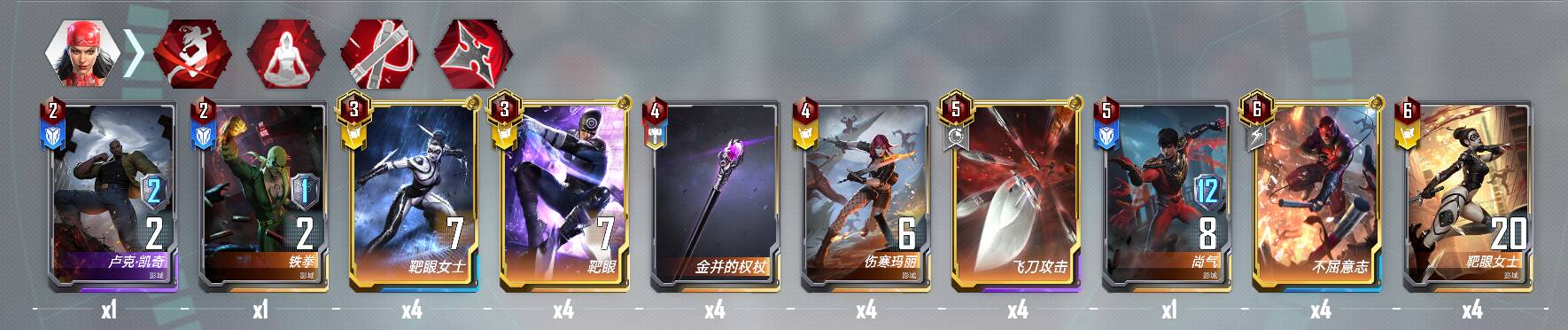 5费:飞刀×4,核心输出。尚气起到一个装饰作用。☆不可以携带影域艾丽卡,削弱后1星需要3个抑制队友,这卡组只有俩,无法触发。