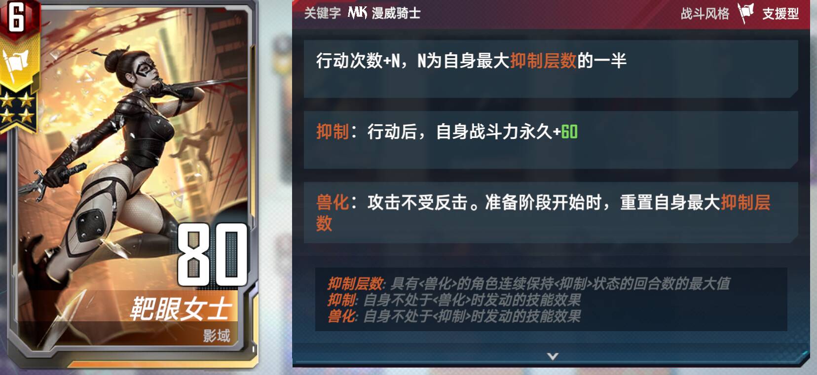1.在本卡组中不会使用到兽化效果。在抑制层数不会重置的情况下她的行动次数可以无上限叠加,非常强力。