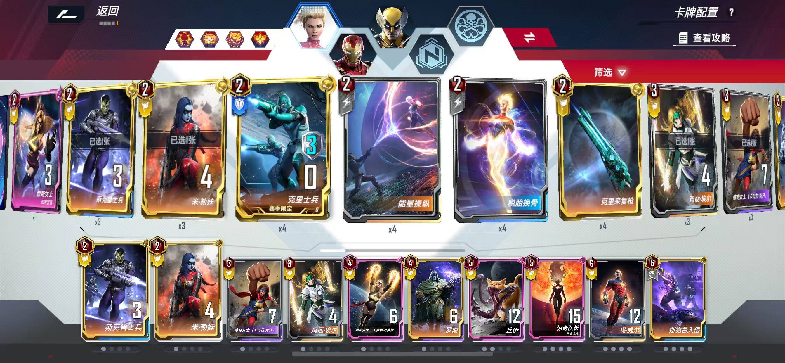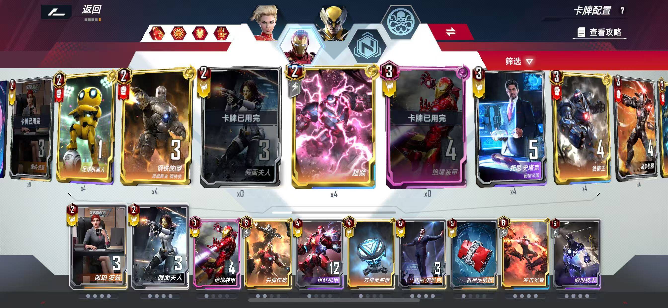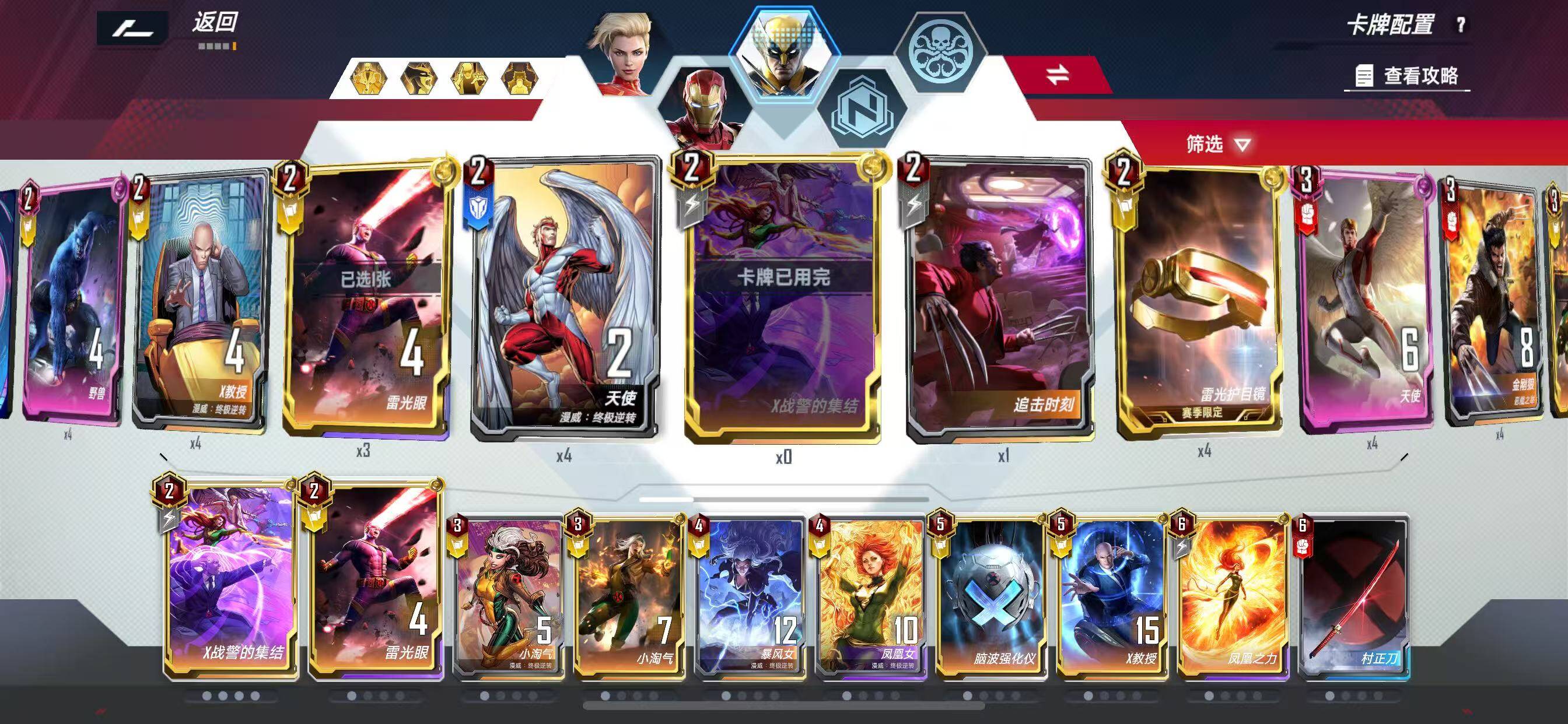 前4-5回合,我们卡2本尽量利用小黄人和小辣椒2人组,来扩大的我们前期经济优势和滤牌速度!(这里推荐九头蛇锁,前期经济和滤牌会非常顺滑),加快X战警终幕的成型速度(基本上都是4回合左右完做),虽然X战警终幕被砍,但确实反向加强了,我们这套小黄人链接的中期和后期战力!此卡组没有加血,无比控制好自身血量,如果X终幕成型早,小黄人没有4星或者假面夫人没有2+1或4星,可以卡一回合找一下,再去上本!