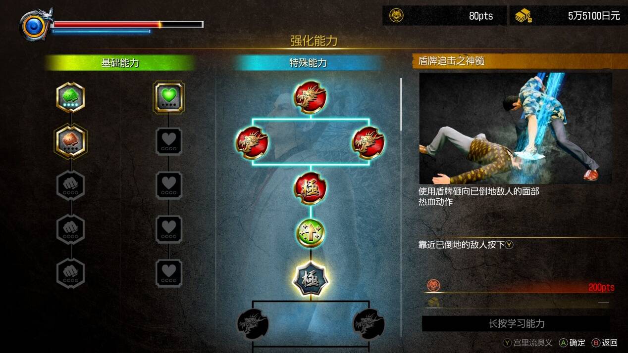 桐生的战斗系统采用了熟练度+金钱分项解锁的设计,同时引入了交叉在一起的技能树取代了近代《如龙》常见的条目式解锁。同时,也随之减少了解锁项目的总体数目,玩家可以更快的达成一个较为完全体的状态。