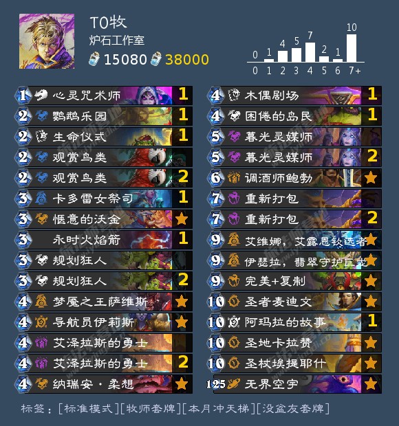 核心思路 - 过牌减费:鹦鹉乐园+观赏鸟类+暮光灵媒师快速过牌+减费- 9费启动:艾维娜+艾泽拉斯勇士,一回合铺满大哥+无限火球斩杀- 续航:圣杖+重新打包,双倍法伤+双倍回复