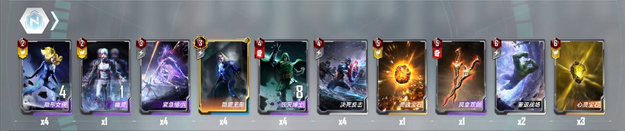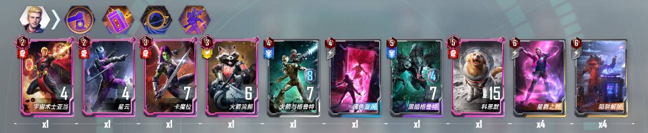 4费:援军凑数,有格子就打出;黑色旋涡必带,在拿到4星毁灭后,贴给毁灭把他晕住,防止他撞死,如果拿到希娜的眩晕3个高战力技能,也可以不贴;