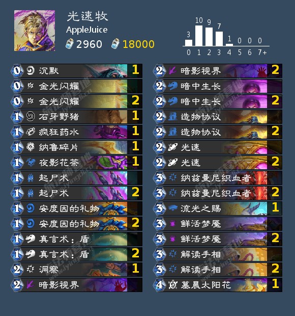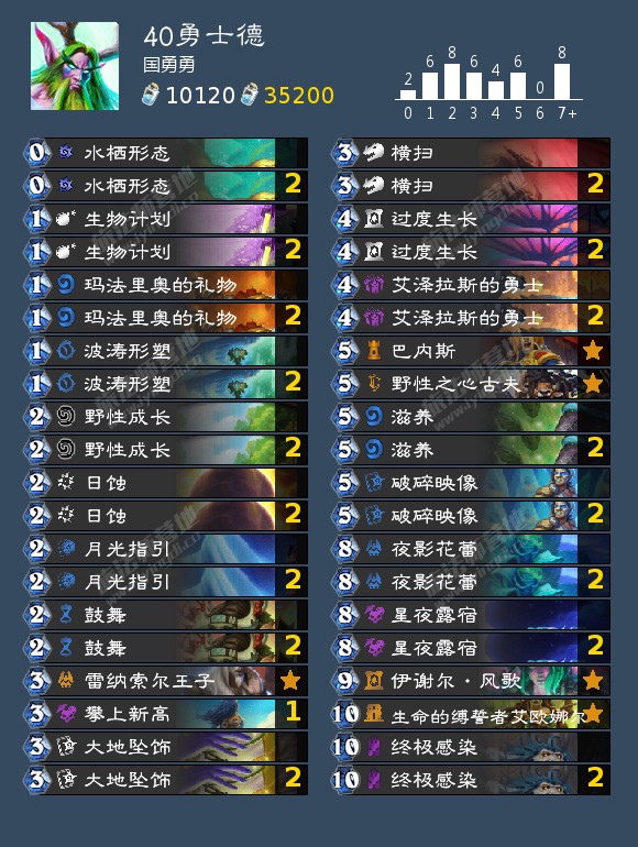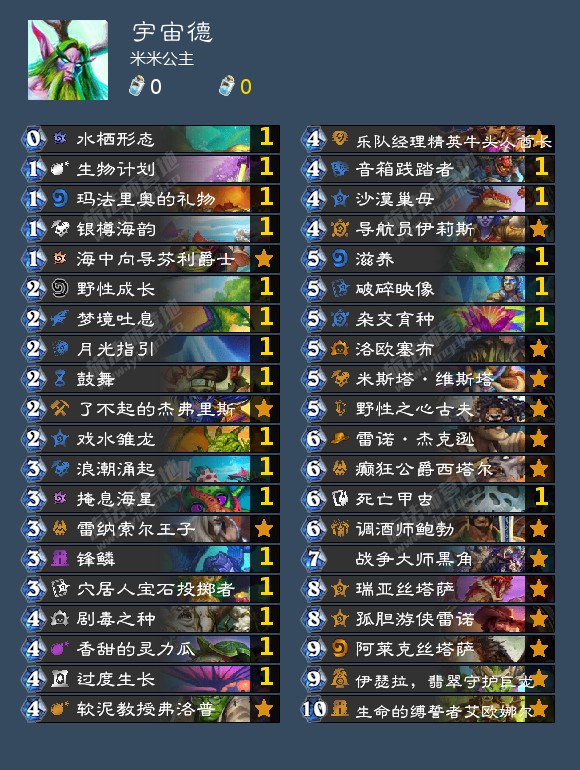 最后则是米米公主的宇宙德。 宇宙德是目前环境里使用黑角最得当的卡组了。跳费黑角就是和7费再拍不一样,德鲁伊甚至有灵力瓜定向检索黑角。宇宙德其实是一种变相的星界德,起手留跳费,姐夫和该对局可能用到的干扰牌。牛塞可换监禁。